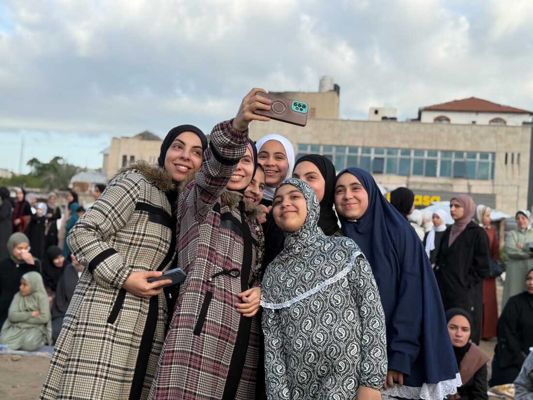 Young women pose for selfies in Gaza City on Friday.