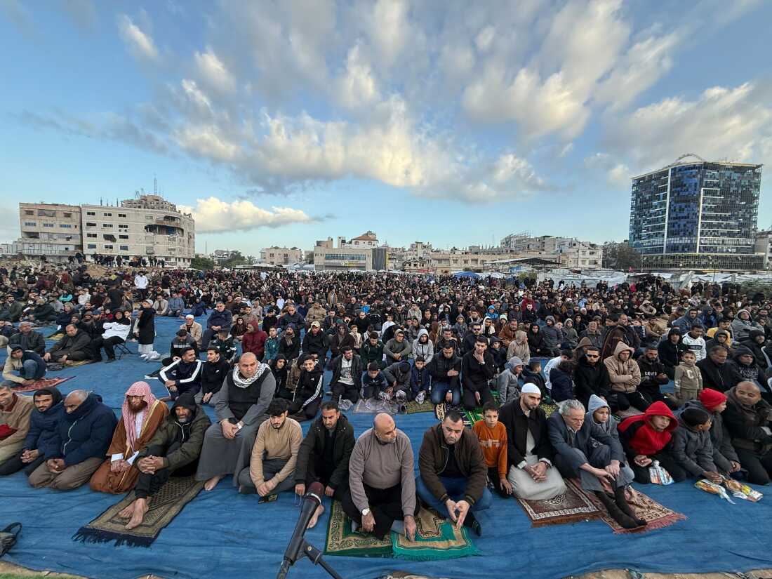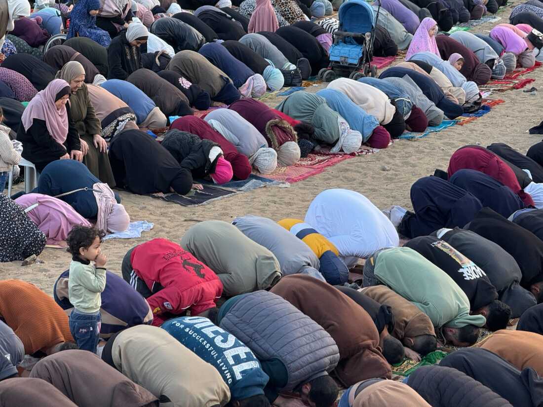 Palestinians pray in Gaza City and Eid prayers rang through the streets.